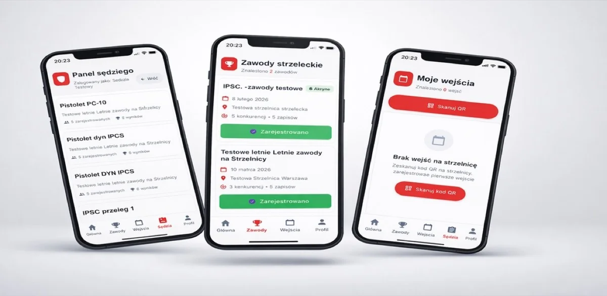 - Wejścia na strzelnicę: skan QR, weryfikacja GPS, podpis, historia wejść w aplikacji